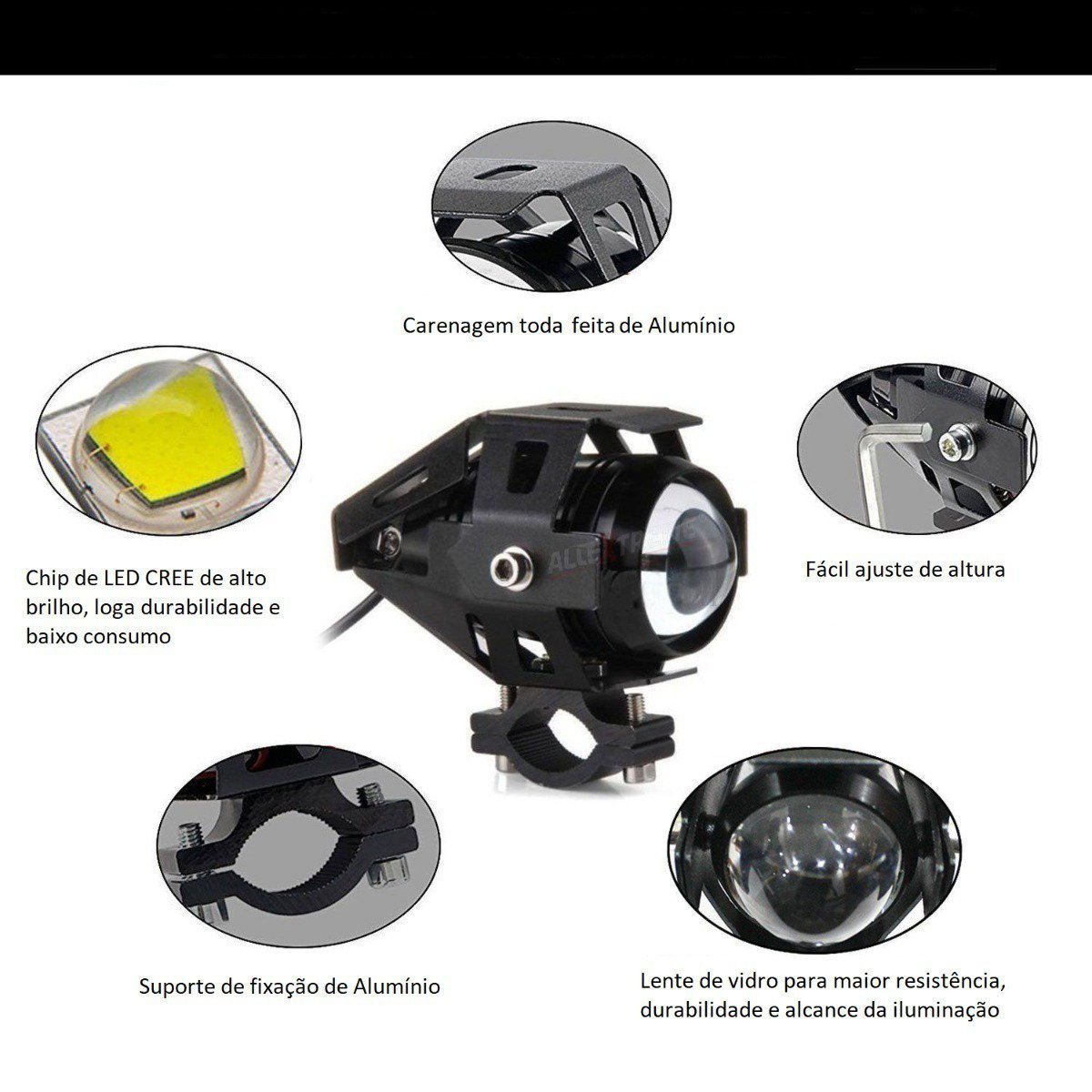 - 3 funções: farol alto/ farol Baixo e strobo